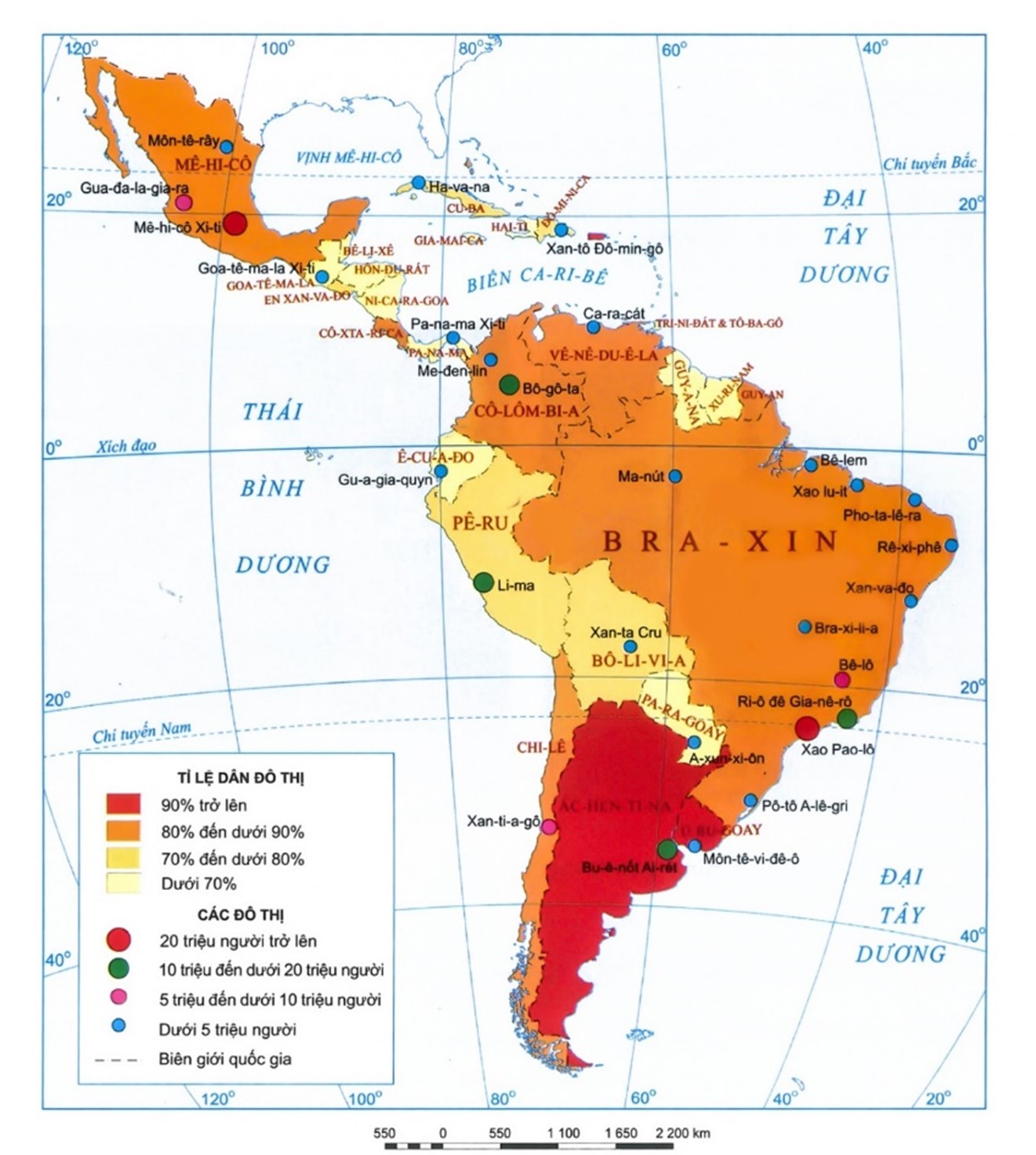 BẢN ĐỒ TỈ LỆ DÂN ĐÔ THỊ VÀ MỘT SỐ ĐÔ THỊ Ở TRUNG VÀ NAM MỸ NĂM 2020