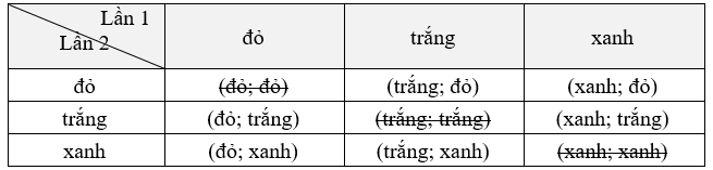 Vì màu của quả bóng trong hai lần lấy ra không trùng nhau nên các kết quả bị gạch đi trong bảng không thuộc không gian mẫu của phép thử.