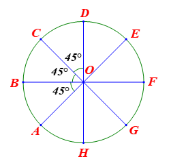 Ta có một bát giác đều \(ABCDEFGH\) nội tiếp trong đường tròn \(\left( O \right)\), mỗi góc ở tâm là: \(360^\circ :8 = 45^\circ .\)