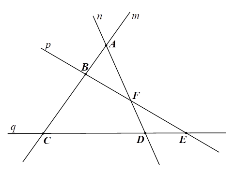 Các đoạn thẳng trong hình vẽ trên là \(AB,\) \(AC,\) \(AD,\) \(AF,\) \(BC,\) \(BE,\) \(BF,\) \(CD,\) \(CE,\) \(DE,\) \(DF,\) \(EF.\)