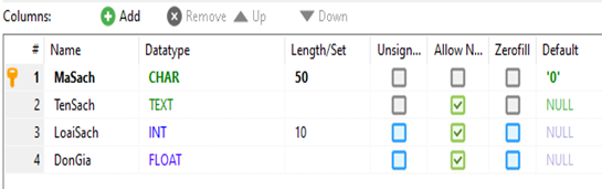 a. Trường MaSach là khoá chính của bảng Sach và cho phép để trống giá trị.