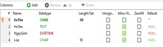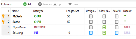 c. Trong bảng MuonSach có 2 trường MaSach và Sothe cùng là Khóa chính.
