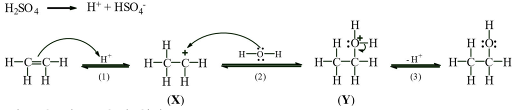 Cơ chế của phản ứng hợp nước (hydrate hóa) ethylene trong môi trường acid (H2SO4loãng), đun nóng được mô tả qua các giai đoạn sau: