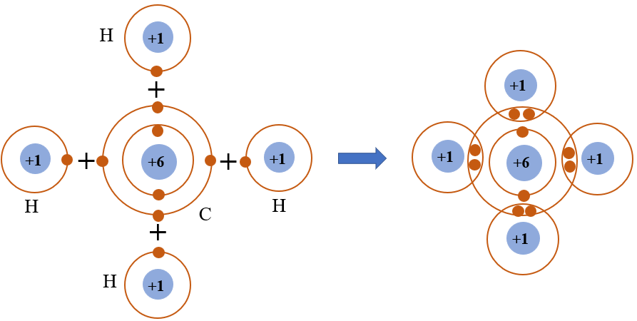 Mỗi nguyên tử carbon có 4 electron ở lớp ngoài cùng, mỗi nguyên tử hydrogen có 1 electron ở lớp ngoài cùng. Để có cấu trúc bền vững của khí hiếm, khi hình thành phân tử methane, bốn nguyên tử hydrogen đã liên kết với một nguyên tử carbon bằng cách nguyên tử carbon góp chung với mỗi nguyên tử hygrogen 1 electron tạo thành cặp electron dùng chung.