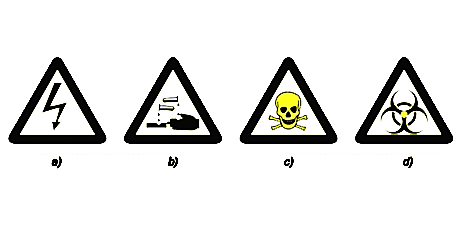 (0,5 điểm): Hãy chỉ ra nội dung cảnh báo về chất độc, chất ăn mòn, chất độc sinh học, điện cao thế, ứng với mỗi kí hiệu trong hình dưới đây.