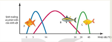 (a) Ở một địa phương, người ta có ý định nhập nội ba loài cá (A, B, C) về nuôi. Nhiệt độ trung bình trong năm tại đây dao động từ \({15}^{0}\)C đến \({30}^{0}\)C. Dựa vào thông tin về giới hạn sinh thái nhiệt độ của mỗi loài cá (Hình 41.4) hãy cho biết nên nhập loại cá nào để nuôi tại đây và giải thích.