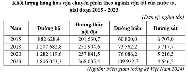 Căn cứ vào bảng số liệu trên, hãy cho biết trong giai đoạn 2015-2023, tốc độ tăng trưởng khối lượng hàng hóa vận chuyển đường thuỷ nội địa lớn hơn tốc độ tăng trưởng của đường sắt bao nhiêu phần trăm (làm tròn kết quả đến hàng đơn vị).