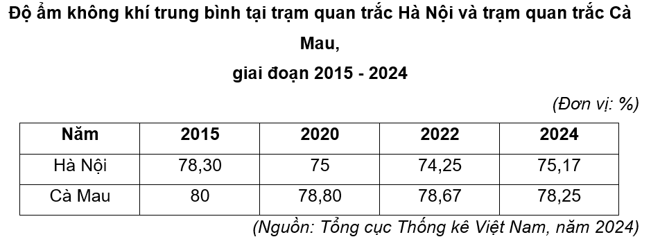 Căn cứ vào bảng số liệu trên, hãy cho biết độ ẩm không khí của năm có độ ẩm không khí thấp nhất tại trạm quan trắc Cà Mau cao hơn độ ẩm không khí của năm có độ ẩm không khí thấp nhất tại trạm quan trắc Hà Nội là bao nhiêu phần trăm (làm tròn kết quả đến hàng đơn vị).