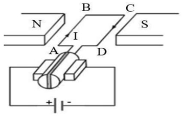 Xe đạp điện, xe máy điện là các ứng dụng của động cơ điện một chiều. Nguyên lí hoạt động của động cơ điện một chiều được mô tả như hình vẽ bên. Khung dây hình chữ nhật ABCD có kích thước \({\rm{AB}} = 30,0{\rm{\;cm}};{\rm{BC}} = 20,0{\rm{\;cm}}\); đặt trong từ trường đều giữa hai cực của nam châm có độ lớn cảm ứng từ là \(0,60{\rm{\;T}}\). Biết cạnh AB và CD luôn vuông góc với các đường sức từ.