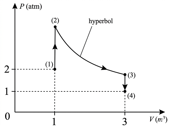 Một lượng khí xác định biến đổi theo các quá trình (1) - (2) - (3) - (4) như hình vẽ. Biết nhiệt độ của chất khí ở trạng thái (1) là \({{\rm{T}}_1} = 400{\rm{\;K}}\). Nhiệt độ của chất khí này ở trạng thái (4) là