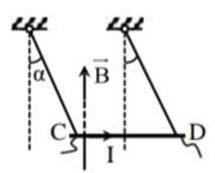 Khi ngắt dòng điện, lực từ mất đi. Thanh bắt đầu dao động từ vị trí lệch góc \(\alpha \) về vị trí cân bằng thẳng đứng. Cơ năng bảo toàn.