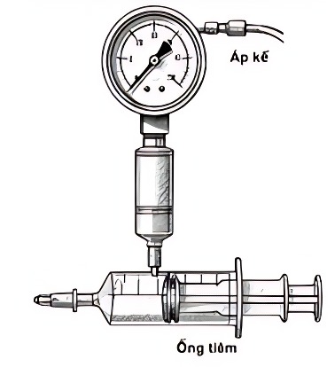 Trong thí nghiệm được thể hiện trong sơ đồ, thể tích không khí bên trong ống tiêm là 25 ml khi áp suất là \[1,{0.10^5}\,N/{m^2}\]. Thể tích không khí là bao nhiêu khi áp suất là \[0,{5.10^5}\,N/{m^2}\]? (Giả sử khối lượng không khí và nhiệt độ trong ống tiêm là không đổi).