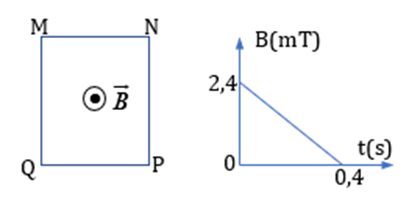 *Độ lớn suất điện động: \(e = N\left| {\frac{{\Delta \Phi }}{{\Delta t}}} \right| = NS\left| {\frac{{\Delta B}}{{\Delta t}}} \right| = {10.25.10^{ - 4}}\left| {\frac{{0 - 2,{{4.10}^{ - 3}}}}{{0,4}}} \right| = 1,{5.10^{ - 4}}V = 0,15mV\)