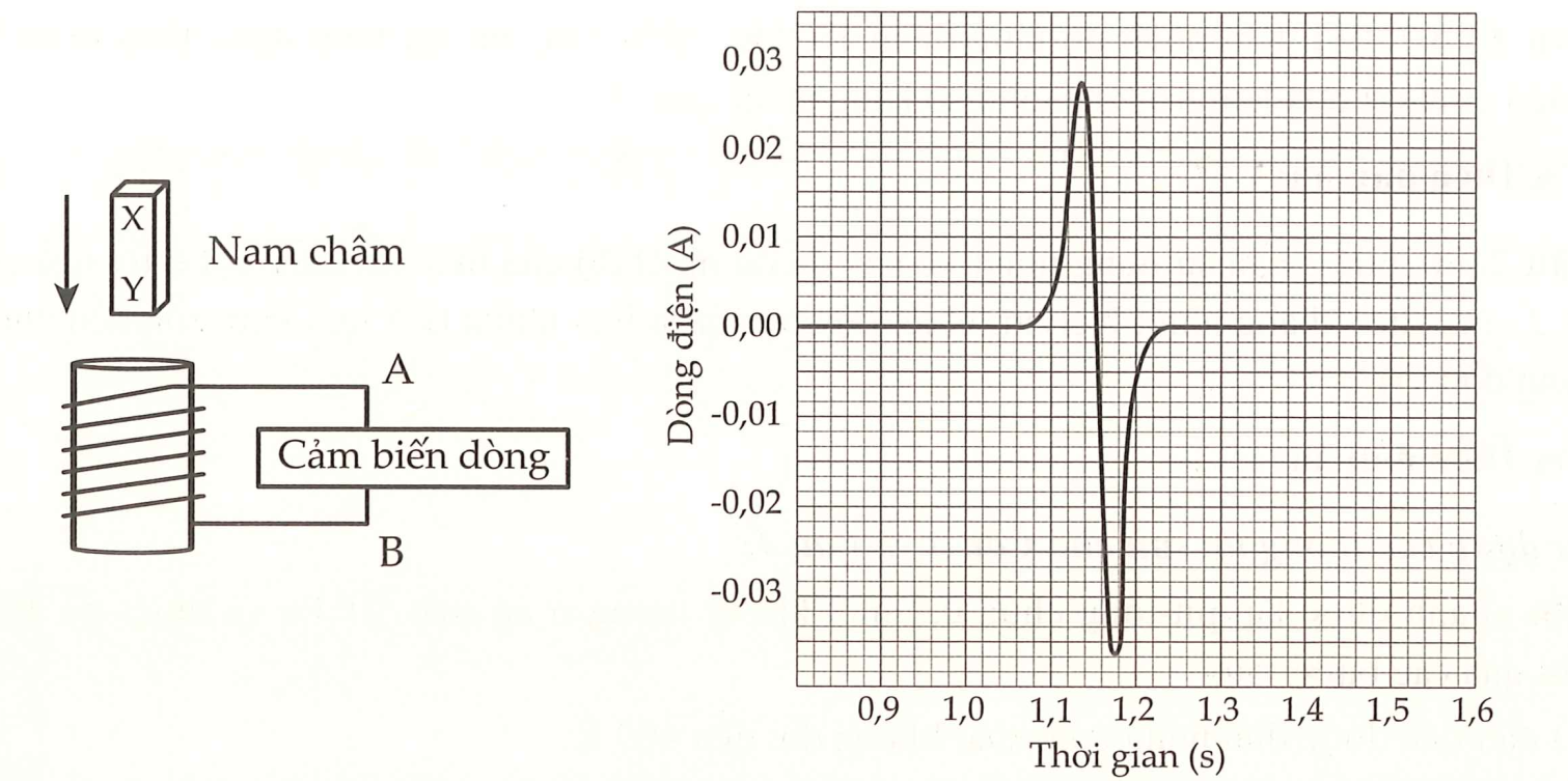 Khi nam châm bắt đầu rơi xuống, xuất hiện dòng điện trong ống dây làm nó trở thành một nam châm điện có đầu đóng vai trò là cực bắc.