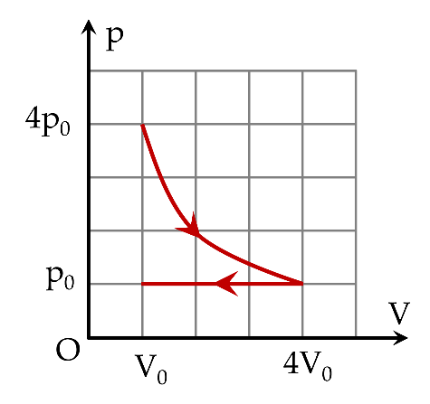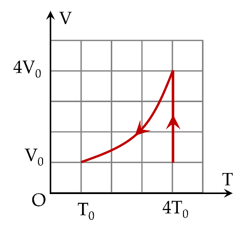 Một khối khí ban đầu ở trạng thái \[{p_0},{V_0},{T_0}.\]Giãn đẳng nhiệt đến thể tích \[4{V_0}\]sao đó biến đổi đẳng áp về lại thể tích ban đầu. Đồ thị nào sau đây diễn tả đúng quá trình trên.