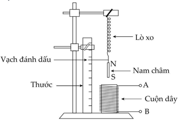 Khi có dòng điện chạy qua ống dây, nam châm sẽ bị hút xuống làm lo xo bị dãn thêm.
