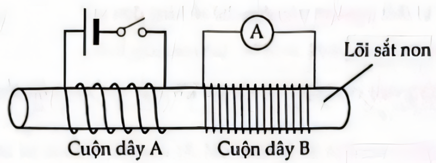Dòng điện chạy qua cuộn A đang ổn định thì một học sinh mở công tắc để ngắt mạch, khi công tắc được mở có một dòng điện chạy qua ampe kế trong giây lát.