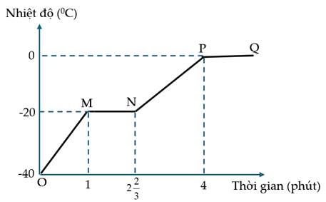 Trong một bình cách nhiệt có: 1 kg nước đá, 1 kg một chất A dễ nóng chảy hơn nước đá, không tan được trong nước, và một bếp điện công suất không đổi, nhiệt dung không đáng kể. Nhiệt độ ban đầu trong bình là \( - {40^ \circ }{\rm{C}}\). Sau khi cho bếp hoạt động, nhiệt độ trong bình biến đổi theo thời gian như đồ thị trong hình bên. Cho biết nhiệt dung riêng của nước đá là \({{\rm{c}}_{\rm{d}}} = {2.10^3}{\rm{\;J}}/\left( {{\rm{kg}} \cdot {\rm{K}}} \right)\), chất rắn A là \({\rm{c}} = {10^3}{\rm{\;J}}/\left( {{\rm{kg}} \cdot {\rm{K}}} \right)\).