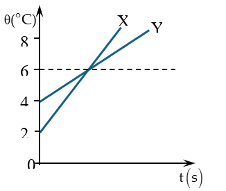 Hai vật \(X\) và \(Y\) được đun nóng riêng rẽ bằng các lò sưởi có cùng công suất. Chúng được làm từ cùng một vật liệu. Đồ thị bên biểu diễn sự thay đổi nhiệt độ \(\theta \) của \(X\) và \(Y\) theo thời gian \(t.\) Tỷ số khối lượng của \(X\) so với \(Y\) là bao nhiêu?