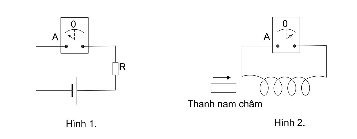 Một điện kế A có số chỉ 0 khi kim ở chính giữa được mắc nối tiếp với điện trở R và một pin có hiệu điện thế 1,5 V như hình 1, kim chỉ của điện kế bị lệch sang trái. Sau bố trí lại thí nghiệm điện kế được nối với một cuộn dây như hình 2.