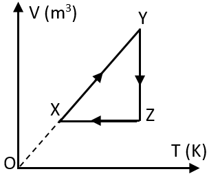 Đồ thị biểu diễn mối quan hệ \[V - T\] của một lượng khí lí tưởng cố định. Điểm \[X\] biểu thị trạng thái ban đầu của khí. Khí thay đổi trạng thái từ \[X\] thành \[Y,\] sau đó từ \[Y\] thành \[Z\] và cuối cùng từ \[Z\] trở lại \[X\] theo đường đi được biểu diễn. Phát biểu nào sau đây về áp suất của khí là đúng?