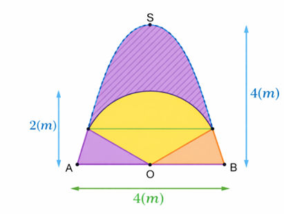 Trên một bức tường, người ta trang trí một hình phẳng dạng Parabol có đỉnh \(S\) và trục đối xứng \(SO\) vuông góc với sàn \(AB\). Biết chiều cao bức tường \(OS = 4m\) và độ rộng chân tường \(AB = 4m\)(\(O\)là trung điểm của \(AB\)). Để tạo điểm nhấn, một hình quạt tròn tâm \(O\), bán kính \(R = 2m\)được thiết kế ở giữa như hình vẽ