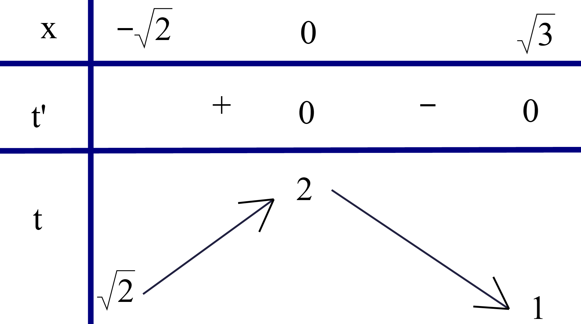 Đặt \(t = \sqrt {4 - {x^2}} ,t' = \frac{{ - x}}{{\sqrt {4 - {x^2}} }}\); \(t' = 0 \Leftrightarrow x = 0 \in \left[ { - \sqrt 2 ;\sqrt 3 } \right)\).