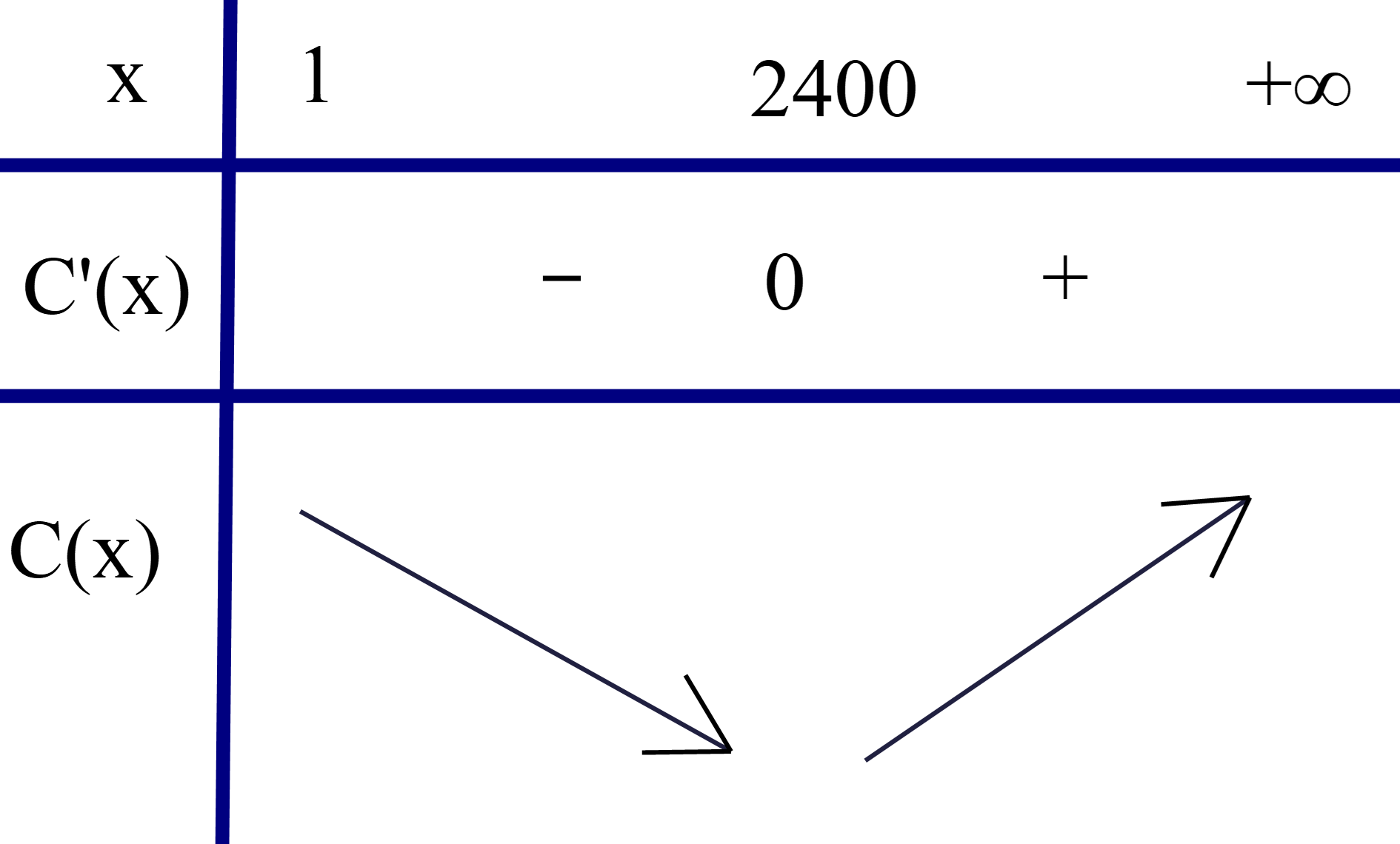 Dựa vào bảng biến thiên ta có để chi phí vận chuyển trung bình cho mỗi kiện hàng là nhỏ nhất thì công ty cần chọn số kiện hàng \(x = 2400\).