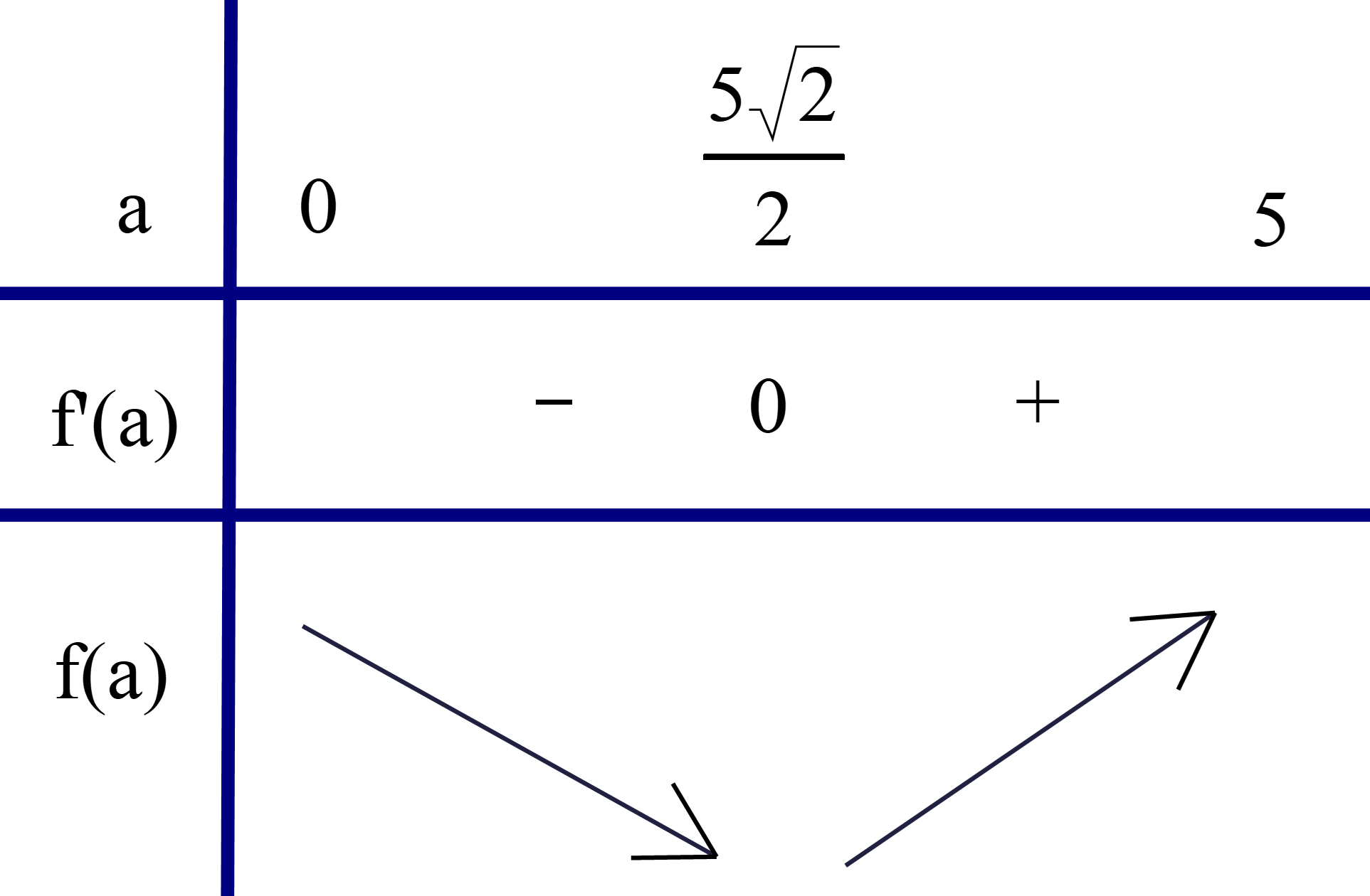 Xét \[f'\left( a \right) = 0 \Leftrightarrow - 2500 + 200{a^2} = 0 \Leftrightarrow {a^2} = 12,5 \Leftrightarrow a = \sqrt {12,5} = \frac{{5\sqrt 2 }}{2}\].