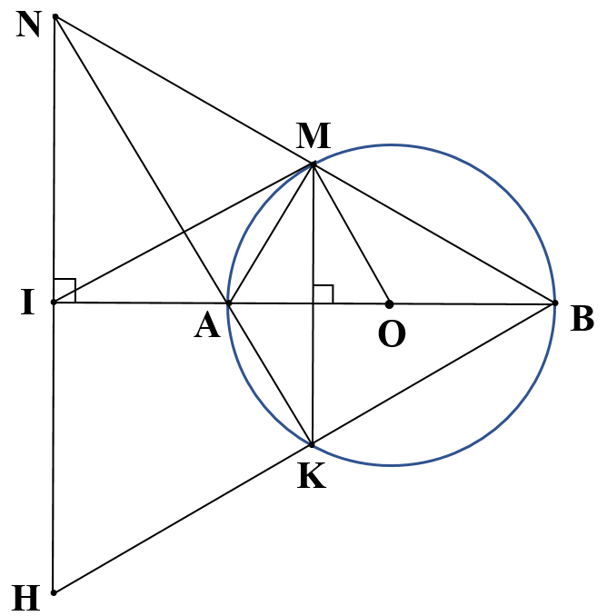 Cho đường tròn (O; R) đường kính AB, trên đường tròn lấy điểm M sao cho AM = R. Qua M vẽ đường thẳng vuông góc với AB cắt đường tròn (O; R) tại điểm thứ hai là K, hai đường thẳng BM và KA cắt nhau tại N. Qua N kẻ đường thẳng vuông góc với AB cắt AB tại I.