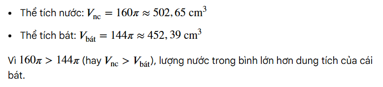 Một bác nông dân có một bình đựng nước chè xanh, phần chứa nước là dạng hình trụ có bán kính đáy bằng 4 cm, mực nước trong bình có chiều cao bằng 10 cm. Bác muốn đổ hết nước từ bình sang một cái bát uống nước, phần chứa nước là dạng nửa hình cầu có bán kính bằng 6 cm (hình vẽ). Hỏi nếu đổ như vậy thì nước có bị tràn ra ngoài hay không? Vì sao?