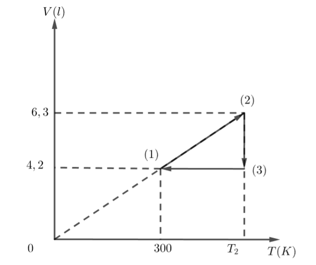 \[\frac{{{V_1}}}{{{T_1}}} = \frac{{{V_2}}}{{{T_2}}}\]\( \Leftrightarrow {T_2} = 450K.\)