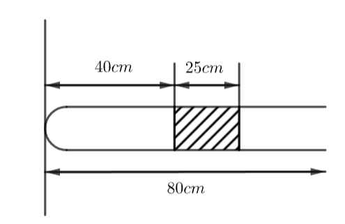 Như minh họa ở hình bên, một ống thủy tinh dài \[80\,cm\]đặt nằm ngang, cột thủy ngân dài \[25\,cm\] bịt kín một cột không khí dài \[40\,cm.\] Bây giờ từ từ xoay ống theo phương thẳng đứng, đầu hở hướng xuống. biết áp suất khí quyển là \(76{\rm{ cmHg}}\) và nhiệt độ cột không khí không đổi. Lúc này, cột không khí trong ống có chiều dài là