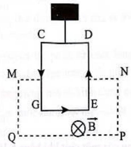 Một khung dây \(CDEG\) được treo bằng một sợi dây dẻo không trọng lượng được đặt trong từ trường đều giới hạn bởi \(MNPQ.\) Cạnh \(EG\) nằm trong vùng có từ trường như hình vẽ. Cho \({\rm{B}} = 0,3\,{\rm{T}};\,{\rm{I}} = 3\,{\rm{A}};\,{\rm{EG}} = 10\,{\rm{cm}}{\rm{.}}\) Khối lượng quả nặng cần treo vào \(EG\) để nó trở về vị trí cũ như khi chưa đặt vào từ trường