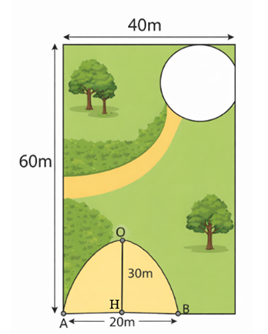 Một công viên nhỏ trong khu dân cư có dạng hình chữ nhật có chiều rộng 40 m và chiều dài 60 m. Ban quản lý lát gạch phần đất dạng parabol và phần đất dạng hình tròn bán kính 10 m như hình vẽ. Phần còn lại sẽ trồng cỏ và cây xanh. Ban quản lí dự định làm một đoạn đường nhỏ nối hai phần lát gạch. Biết \(AB = 20\;m,OH = 30\;m\).