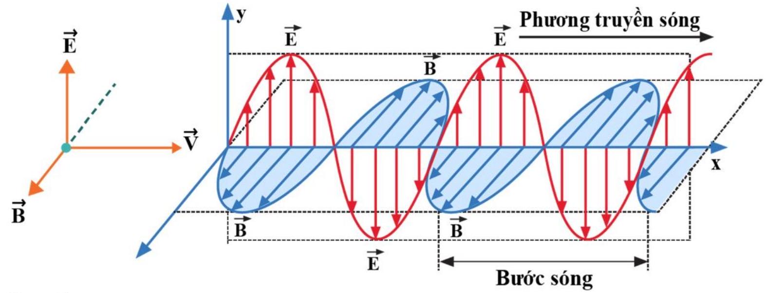 Trong các hình sau, hình nào diễn tả đúng phương và chiều của vectơ cường độ điện trường \(\vec E\), vectơ cảm ứng từ \(\vec B\) và vận tốc truyền sóng \(\vec v\) tại một điểm của một sóng điện từ?