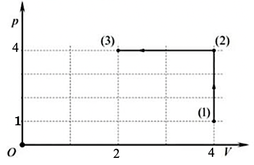 Trong đồ thị (p,V), một lượng khí xác định biến đổi từ trạng thái (1) sang trạng thái (3) bằng hai đẳng quá trình: (1) → (2) và (2) → (3) như hình vẽ. Biết nhiệt độ của chất khí ở trạng thái (1) là T1 = 200 K. Nhiệt độ của chất khí ở trạng thái (3) bằng