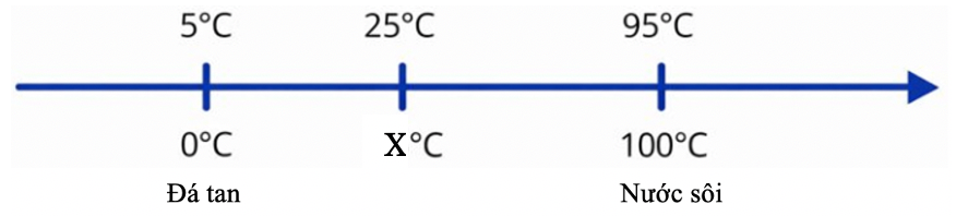\(\frac{{{\rm{X}} - 0}}{{25 - 5}} = \frac{{100 - {\rm{X}}}}{{95 - 25}} \Rightarrow {\rm{X}} = \frac{{200}}{9} \approx 22,{2^ \circ }{\rm{C}}\)