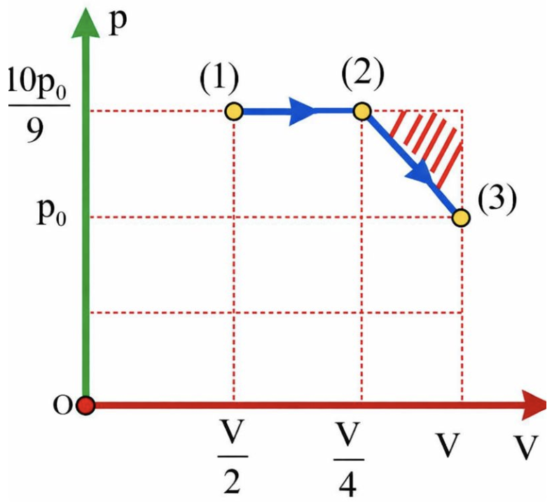 \({\rm{\Delta U}} = \frac{5}{2}\left( {{\rm{nR}}{{\rm{T}}_3} - {\rm{nR}}{{\rm{T}}_1}} \right) = \frac{5}{2}\left( {{{\rm{p}}_0}{\rm{V}} - \frac{{10{{\rm{p}}_0}}}{9}.\frac{{{\rm{\;V}}}}{2}} \right) = \frac{{10}}{9}{{\rm{p}}_0}{\rm{V}}\) (*)