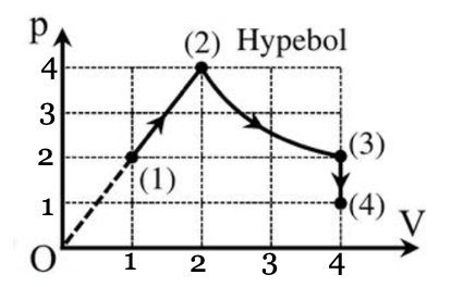 \( \Rightarrow \frac{{{{\rm{T}}_4}}}{{{\rm{\;}}{{\rm{T}}_1}}} = \frac{{{{\rm{p}}_4}.{{\rm{V}}_4}}}{{{{\rm{p}}_1}.{{\rm{V}}_1}}} = \frac{1}{2}.\frac{4}{1} = 2 \Rightarrow {\rm{\;}}{{\rm{T}}_4} = {{\rm{T}}_1}.2 = 300.2 = 600{\rm{\;K}}\)