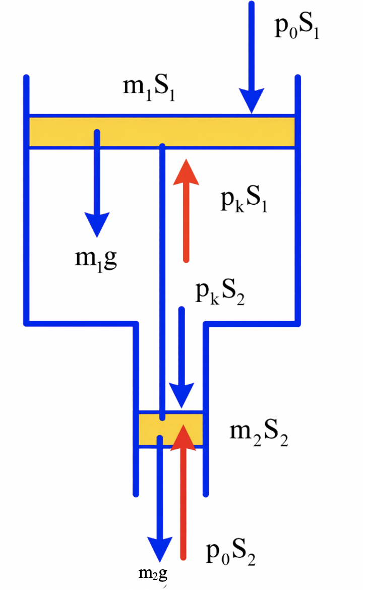 + Lực do áp suất của khối khí bên trong đè lên tiết diện \({{\rm{S}}_2}:{{\rm{p}}_k}.{{\rm{S}}_2}\). (khối khí bên trong nó sẽ tác động áp suất lên mọi bề mặt đẩy \({{\rm{m}}_2}\) xuống