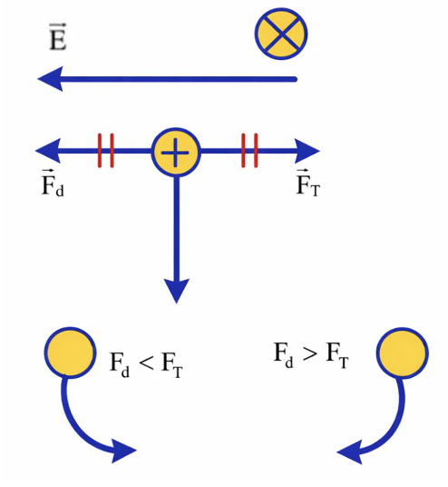 + Nếu \({{\rm{F}}_{\rm{d}}} < {{\rm{F}}_{\rm{T}}}\) kéo các hạt chuyển động lệch hướng sang phải