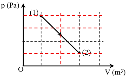 Một khối khí lí tưởng thực hiện quá trình biến đổi trạng thái nhiệt từ trạng thái (1) sang trạng thái (2) mà áp suất p của khối khí phụ thuộc vào thể tích V của nó được mô tả như giản đồ ở hình vẽ bên. Biết ở trạng thái (1) khối khí có nhiệt độ \({{\rm{T}}_1} = 600{\rm{\;K}}\), thể tích \({{\rm{V}}_1} = {2.10^{ - 3}}{\rm{\;}}{{\rm{m}}^3}\) và áp suất \({{\rm{p}}_1} = {2.10^5}{\rm{\;Pa}}\).