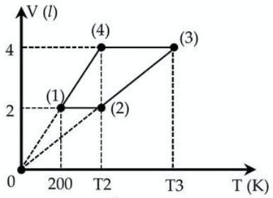 \(\frac{{pV}}{T} = hs \Rightarrow \frac{{2{p_0}.{V_0}}}{{300}} = \frac{{{p_0}.4{V_0}}}{{{T_4}}} \Rightarrow {\rm{\;}}{{\rm{T}}_4} = 600{\rm{\;K}}\).