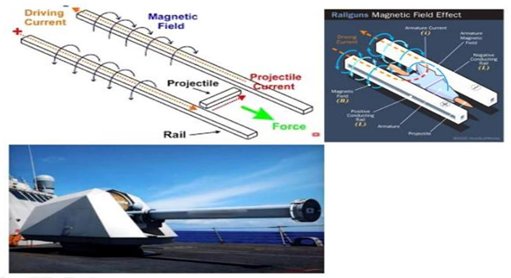 Súng điện tử (Railgun) dùng lực từ để phóng đầu đạn. Cấu tạo chính của Railgun bao gồm hai thanh tay dẫn điện song song (thanh ray dương và thanh ray âm), một đầu đạn nằm trên thanh dẫn điện nằm giữa chúng. Khi có dòng điện chạy từ thanh ray dương qua thanh dẫn gắn đầu đạn rồi sang thanh ray âm, một từ trường mạnh được tạo ra quanh hai thanh ray. Từ trường này tác dụng lực từ lên dòng điện qua thanh dẫn mang đầu đạn, đẩy đầu đạn di chuyển dọc theo các thanh ray và phóng ra ngoài với tốc độ cực cao.