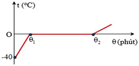 Một nhóm học sinh thực hiện thí nghiệm xác định nhiệt nóng chảy riêng của nước đá. Nhóm cung cấp nhiệt năng cho một lượng nước đá với công suất không đổi, theo dõi nhiệt độ \(\left( t \right)\) theo thời gian thu được đồ thị như hình vẽ.