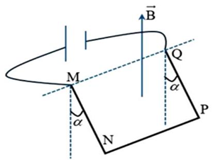 Một thanh dẫn đồng chất, tiết diện đều, trọng lượng \(P\) được uốn thành khung dây gấp khúc gồm ba đoạn bằng nhau \(MN = NP = PQ = 16,0{\rm{\;cm}}\). Khung dây được treo sao cho có thể quay quanh trục nằm ngang đi qua hai đầu \(M\) và \(Q\). Hai đoạn \(MN\) và \(PQ\) song song với nhau và cùng vuông góc với đoạn \(NP\). Đặt hệ thống vào một từ trường đều có vecto cảm ứng từ hướng thẳng đứng lên trên, độ lớn \(B = 0,50{\rm{\;T}}\). Khi có dòng điện cường độ \(I = 4,00{\rm{\;A}}\) chạy qua khung dây thì khung dây lệch khỏi mặt phẳng thẳng đứng sao cho các đoạn \({\rm{MN}},{\rm{PQ}}\) hợp với phương thẳng đứng một góc \(\alpha \) với . Bỏ qua lực ma sát ở trục quay.