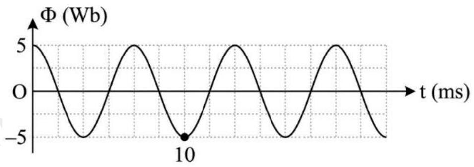 Từ đồ thị, ta thấy giá trị cực đại của từ thông là \({{\rm{\Phi }}_0} = 5{\rm{Wb}}\).