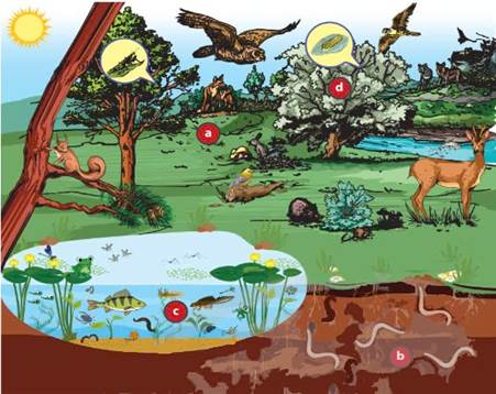 c. Các loài sinh vật khác nhau sinh sống ở các loại môi trường, gồm 4 loại môi trường: môi trường dưới nước (c), môi trường trên cạn (a,d), môi trường trong đất (d) và môi trường sinh vật.
