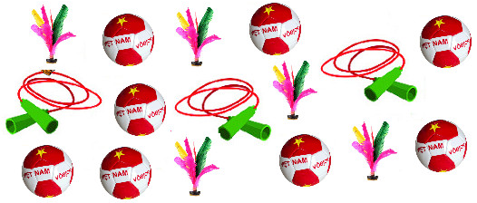 Có 3 quả bóng đá, 5 sợi dây và 8 quả cầu
